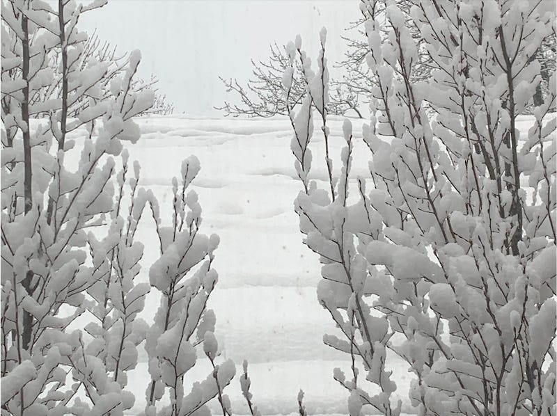 That same Saturday on the east coast, the morning I saw the sundog, it was snowing by late afternoon. Rain had been predicted, but when big, unexpected flakes started falling, I took a short walk. I did it to clear my head, to take in the sere beauty of black-and-white and every shade between — the snow that kept switching to freezing rain and sleet and back again to little melting crystals on my black jacket sleeves.