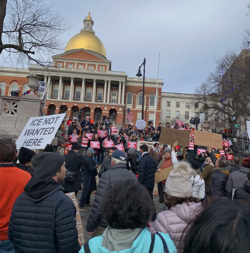 At least he appears to include himself in those who lack political imagination. But as I so often tell journalism students, who is “we” in a sweeping statement like this? It’s not me. It’s not the people I’ve seen and rubbed shoulders with at protests. It was not those at the MLK event in Boston, where many of the speakers were BIPOC local politicians, entertainers, or youth workers. Protesting and voting aren’t empty shrugs. This puts the blame, even if unintentional, on individual cluelessness rather than on its proper target: an authoritarian regime set on terrorizing anyone who resists.