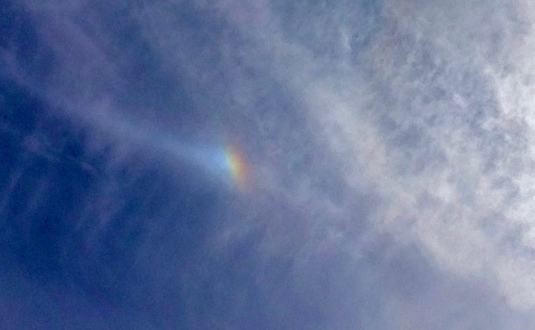 This past Saturday morning, I saw a sundog through my bedroom window. The sun was still low and beyond the frame, the clouds rippled, but there it glowed through a scrim of leafless trees: a vertical patch of light.